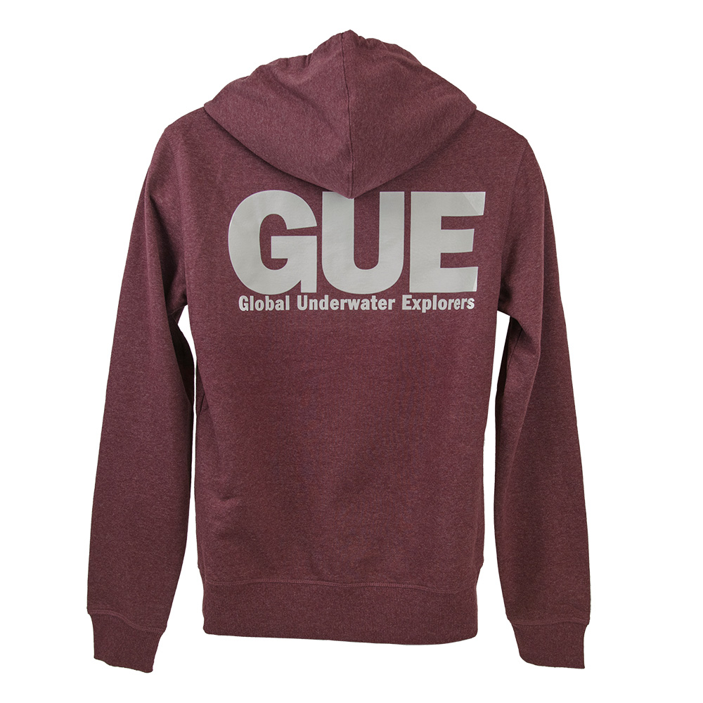 This soft and comfortable GUE zip hoodie has a round logo printed on the front and GUE in block letters on the back, both in white print.