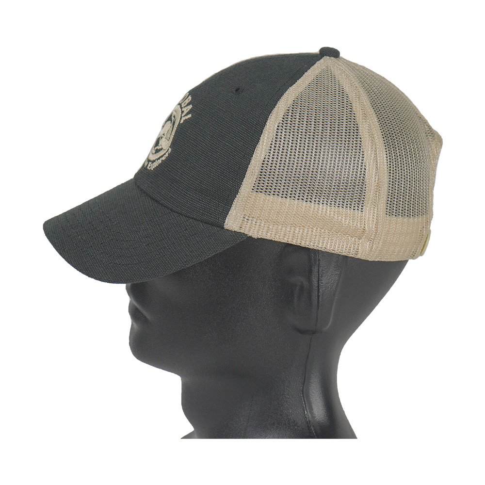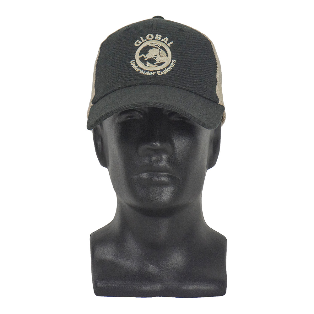This black/tan trucker cap with matching embroidered GUE logo is made of 55% hemp/45% cotton, and