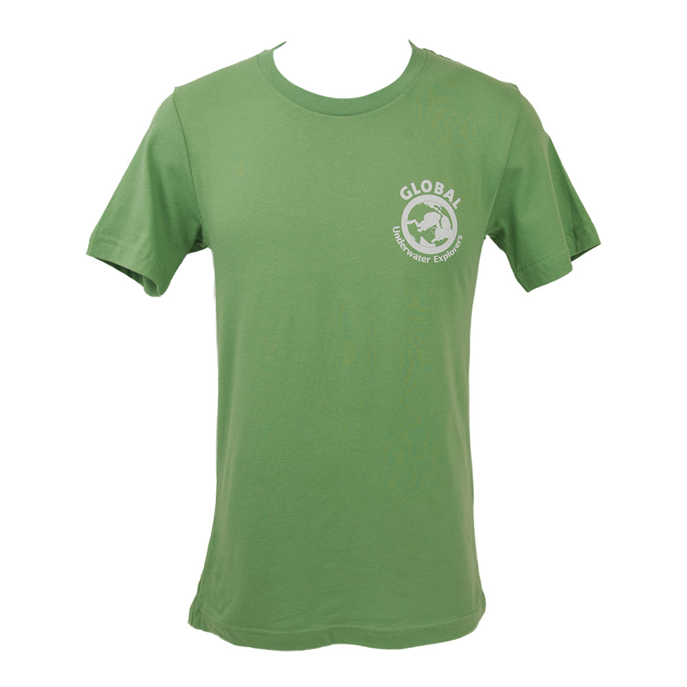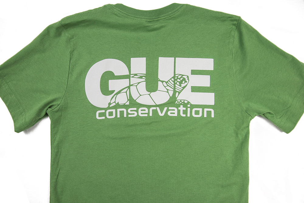 Conservation: This Leaf Green tee features the GUE logo in white on the front left, and white lettering on the back that says ""GUE Conservation"" with a turtle design in the GUE lettering.