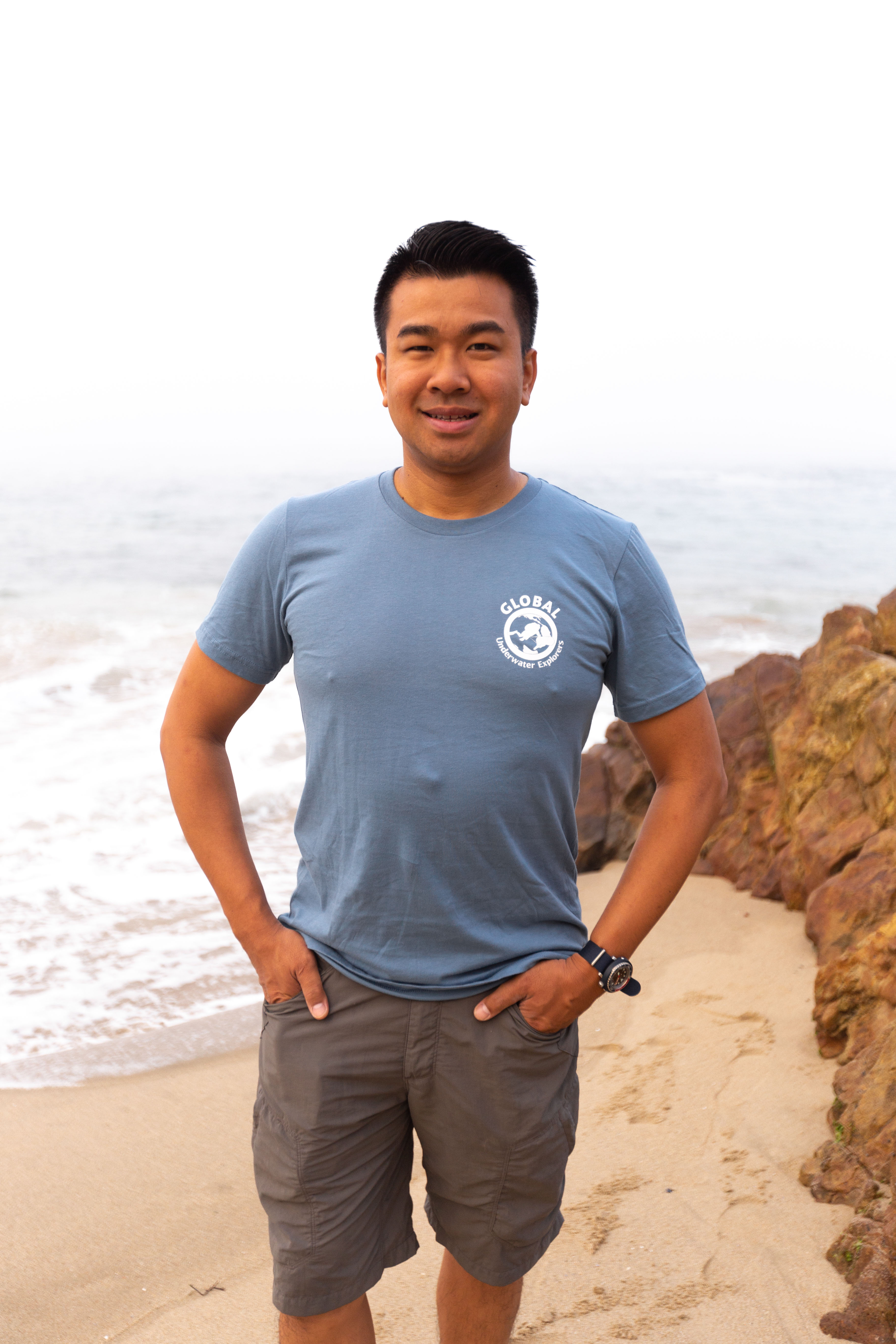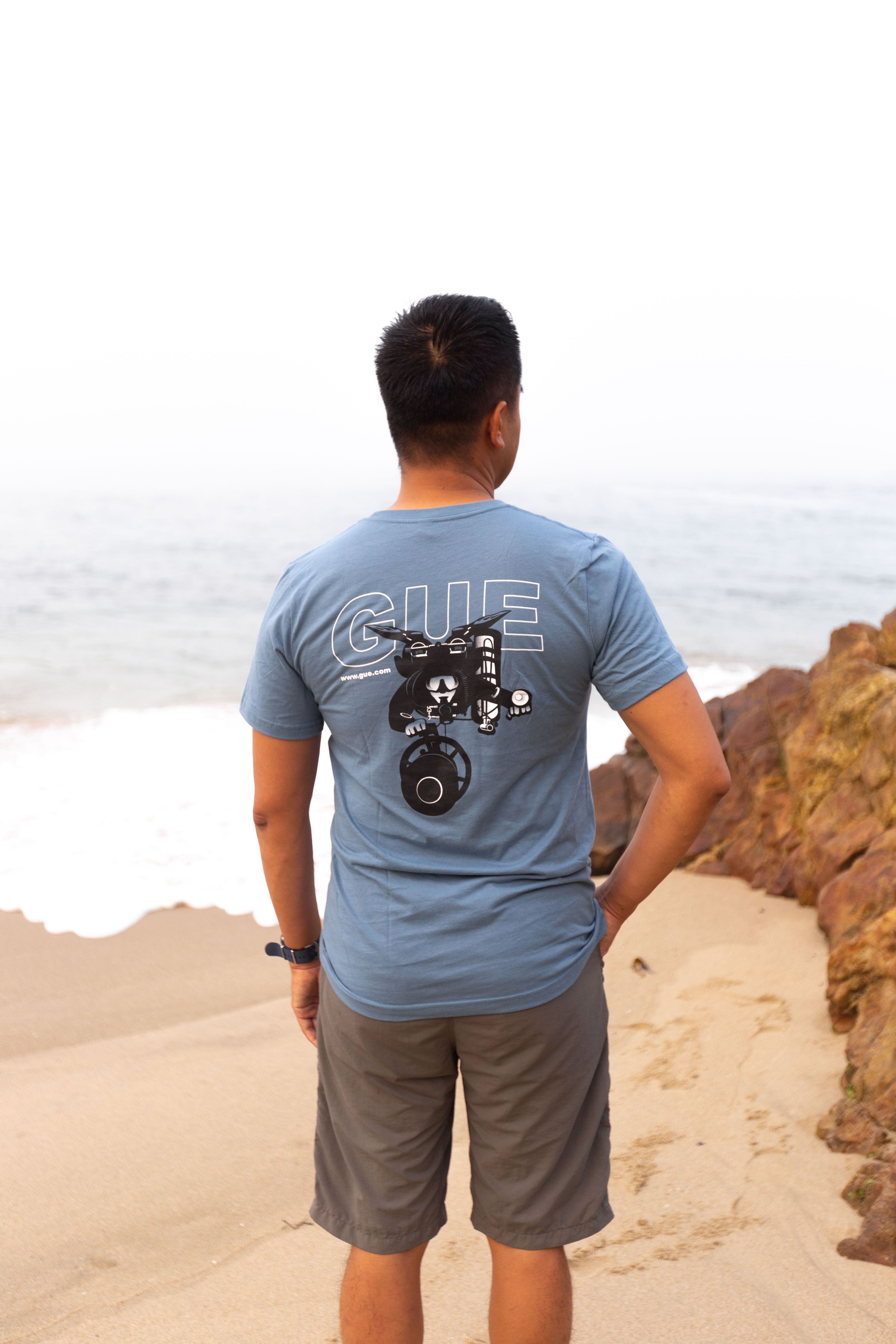 Airlume combed and ring-spun cotton, steel blue with GUE diver on the back and white GUE logo on front left chest.