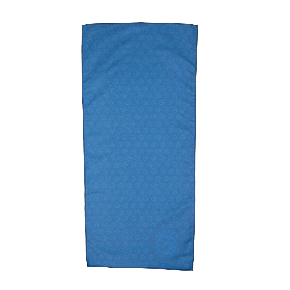 This small, 80% recycled microfiber towel dries quickly and features a fun blue gradient logo print on one side and a small logo pattern on the reverse.