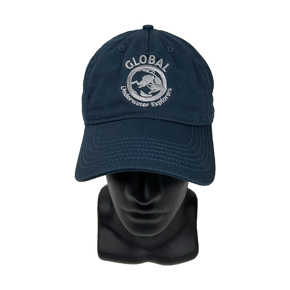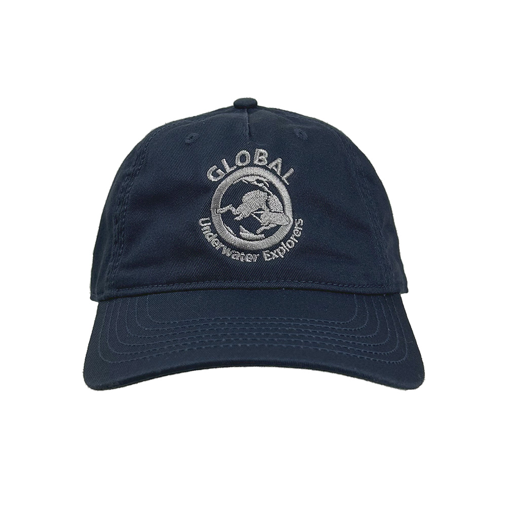 This classic navy blue ballcap with grey embroidered GUE logo is made of 100% certified organic cotton twill.