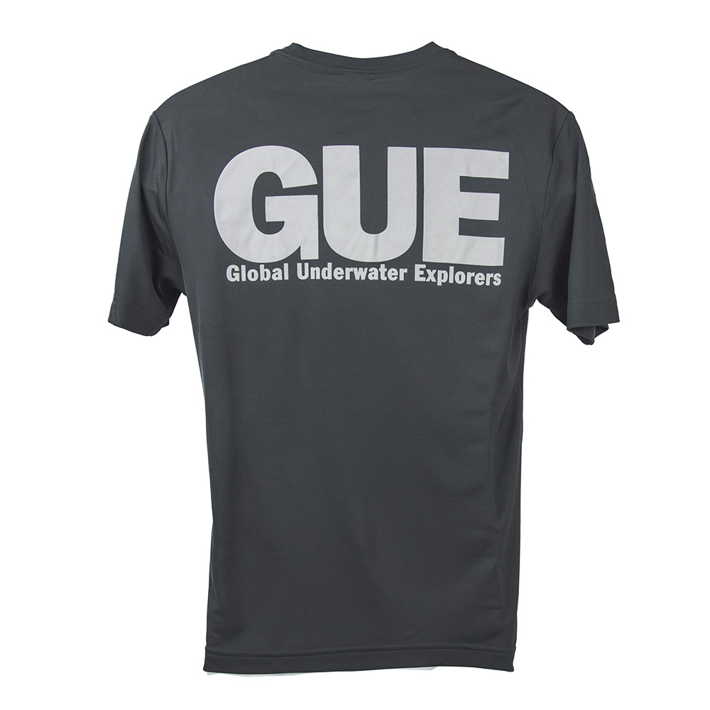 Dark grey shirt features white GUE logos on the front left chest and back.