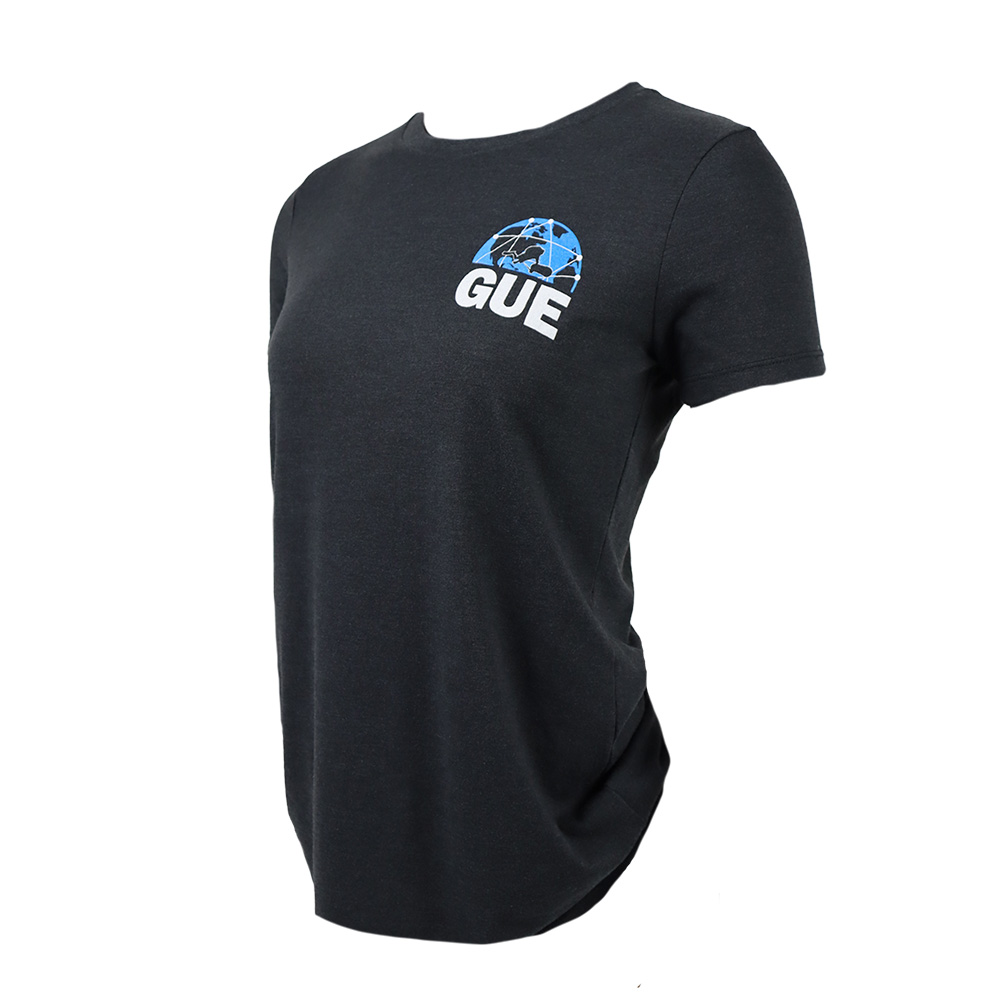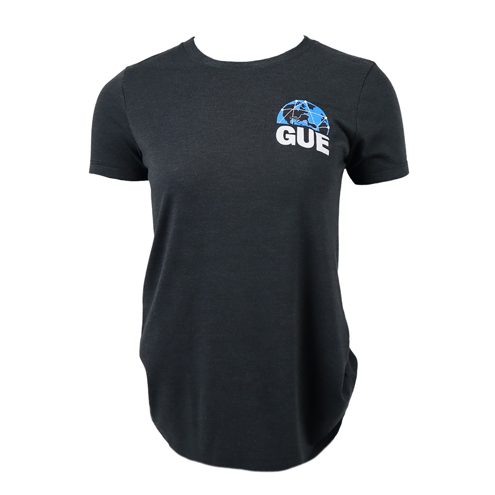 Charcoal grey shirt features a GUE global community graphic on the back with smaller graphic on the front left chest.